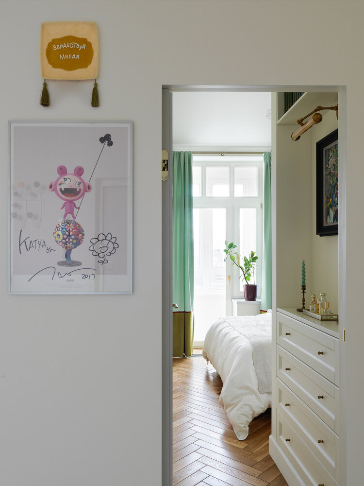 Картина с кисточками, Алина Глазун; постер с работой Такеши Мураками, подписанный автором.