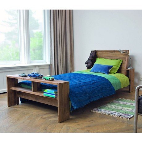 Односпальная кровать из массива тика, удобные полки в изножьи и небольшие ниши у изголовья добавляют практичности и уникальности. Размер матрасного места 90 x 200 см