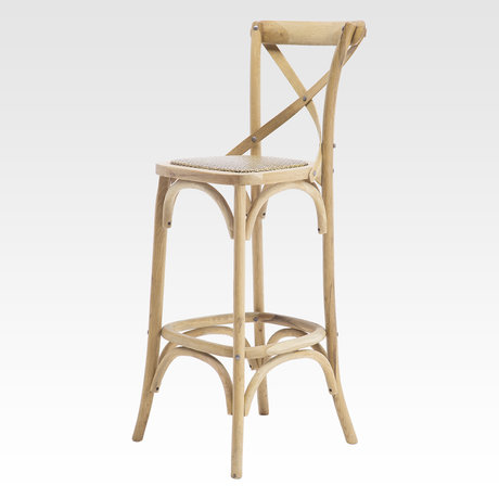 Барный стул бежевого цвета из натуральной берёзы. Сидения - плетёная вставка с лакированной, поверхностью. Нижнее фиксирующее кольцо служит удобной подставкой для ног.