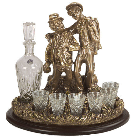 Питейный набор джентльмены удачи декорирован фигурами двух закадычных товарищей. Такое изделие настроит на нужный лад и приведет переговоры в нужное русло. Графин с крышкой и рюмки изготовлены из хрусталя.