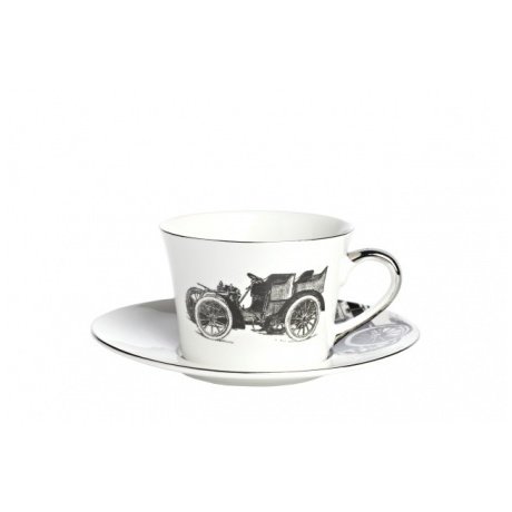 Чайная пара из белоснежно-белого костяного фарфора, украшенная рисунком старинного автомобиля в черных и серых тонах, придающих предметам строгий классический вид и легкий налет старины. В пару входят блюдце и чашка. Так же в этой серии Talbot представлены наборы тарелок.