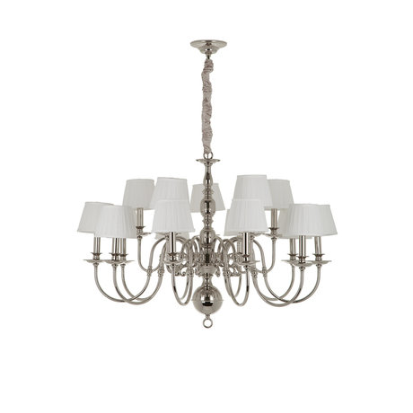Металлическое основание цвета никель, металлические декоративные шары, тканевые абажуры белого цвета Размеры: высота подвеса 90 см, высота основания 8 см диаметр плафона D1 11 см, D2 15 см Цоколь: E14, Мощность: max 15 х 40W