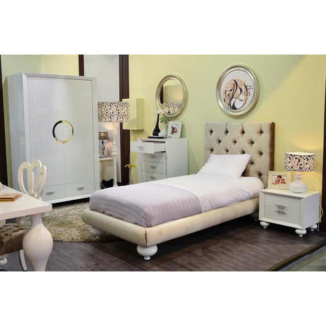 Односпальная кровать итальянского производства с изголовьем, обтянутым велюром, идеально подойдет как для детской, так и для спальни взрослого. Высокое изголовье украшает мелкая стежка-капитоне. Кровать поставляется с решеткой, без матраса. Размер спального места 90*200 см. Рекомендуемая высота матраса -- не более 18 см. Цвета отделки: кремовый и бежевый велюр.