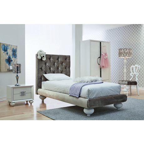 Эксклюзивная односпальная кровать итальянского производства выполнена в стиле современного ар деко. Отделка белый блестящий лак, ткань кремовый велюр. Высокое изголовье украшает мелкая стежка-капитоне. Размер спального места 120 * 200