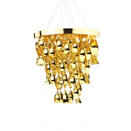 Особенная модель для ценителей роскоши. Люстра выполнена в сверкающем золотом цвете, она дает мягкий золотистый свет. Люстра подвешена на несколько цепей. Она имеет круглое основание из акрила, к которому крепятся декоративные элементы в форме изогнутых полосок акрила золотого цвета. Такая модель станет ключевыми элементом декора в комнате – она мгновенно обращает на себя внимание.