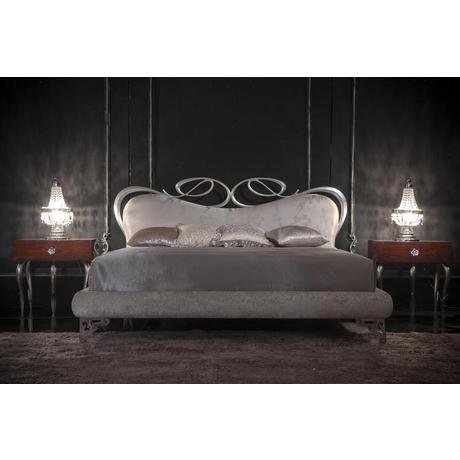 Кровать выполнена из МДФ. Изголовье выполнено из алюминия, покрыто сусальным серебром. База обита велюром. Ноги из нержавеющей стали.