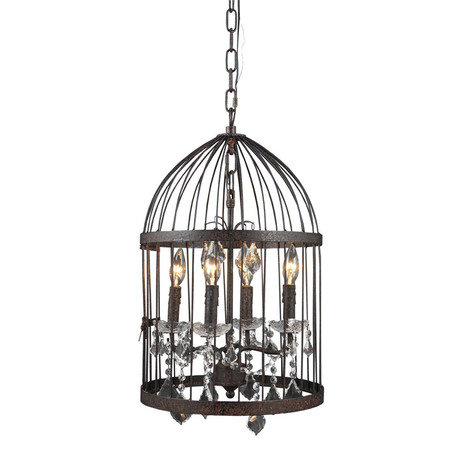 Подвесная интерьерная люстра в американском стиле моментально привлечет внимание и восхищенные взгляды. Шикарный канделябр с подвесками и лампами в форме свечей окутан абажуром в виде клетки для птиц.