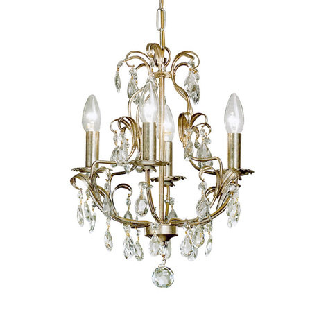 Арматура люстры из металла с серебряным фольгированием. Украшена прозрачными хрустальными подвесками и кулонами Swarovski. Дизайн ламп выполнен в виде свечей в подсвечниках. Высоту светильника можно регулировать за счет звеньев цепи. Дизайн: Karen Lenz. Количество лампочек: 4. Мощность: 4 x 42 Вт. Тип лампы: E14