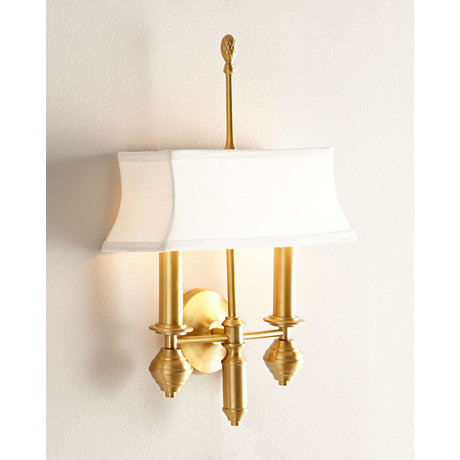 Этот настенный светильнык сочетает в себе индустриальный-шик и архитектурный силуэт, чем непременно привлекает внимание. Выполнено из латуни, металл обработан вручную. Светлый абажур из шелка. Ламп: 2 Мощность: 60W