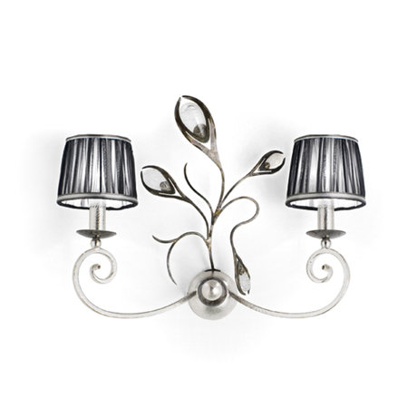 Бра 2-х рожковое выполнено из кованного металла. Текстильные плиссированные абажуры черного цвета. Декор: хрустальные прозрачные камни в виде лепестков на арматуре. 2X MAX 40W E14
