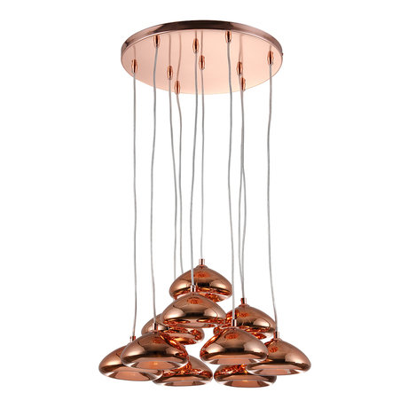 Подвесная люстра с зеркальным сиянием бронзового оттенка состоит из множества плафонов в форме подвесок. Оригинальный дизайн в стиле хай-тек отлично подойдет для кухни или гостиной зоны. Цоколь: G9 Ламп:10 шт Мощность: 40W Материал: металл, стекло