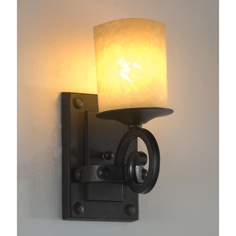 Настенное бра от итальянских дизайнеров выполнено в брутальном стиле - прямые углы, массивные заклепки, черный металл, плафон будто тронутый временем. Для интерьеров в романском стиле, кантри или стиле лофт.