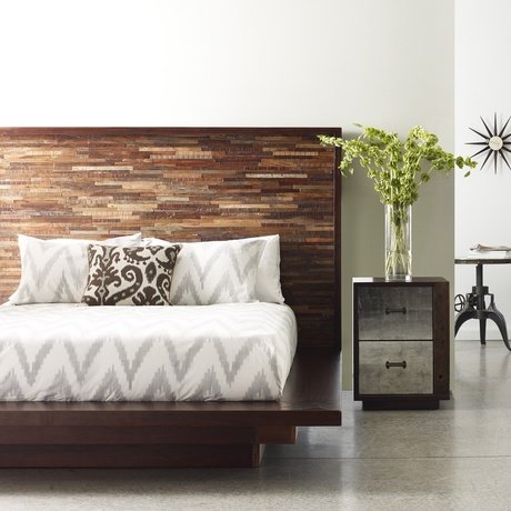 Роскошная кровать с живописным изголовьем, украшенным мозаикой из различных пород дерева. Широкие бортики скрывают основание, и кажется, что она парит в воздухе. Размер матраса для модели King - 205 см x 195 см