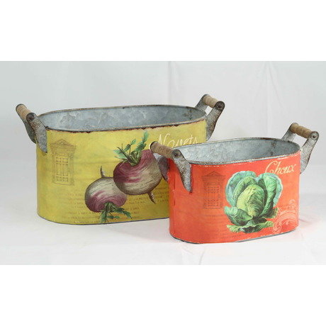 Подобные контейнеры могут стать отличным тематическим хранилищем для овощей (внимательно смотрим на фронтальный рисунок), выполнять роль кашпо (достаточно лишь поставить внутрь горшочек с цветком) или послужить идентификаторами рассады – опять же изучаем рисунки на фасаде. Цвет: мультиколор Размеры: большой - 33х16х18; маленький - 26х13х14.