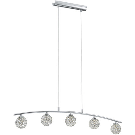 Количество ламп: 5, Мощность: 33, Назначение светильника: подвесной, Стиль светильника: модерн, Материал светильника: металл, Высота: 1100, Длина (мм): 905, Тип лампы: галогенная, Патрон: G9, Цвет арматуры: хром, Вес нетто: 1.965