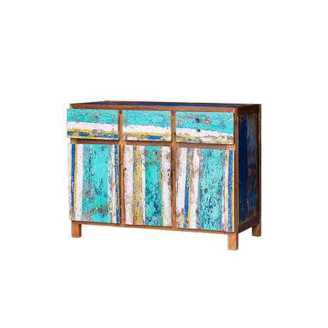 Комод, выполненный из массива древесины старого рыбацкого судна, такой как: тик, махогон, суар, с сохранением оригинальной многослойной окраски. Имеет 3 выдвижных ящика и 3 открывающихся дверцы. Подходит для использования как внутри помещения, так и снаружи. Сборка не требуется. Предмет изготовлен из ценных твердых пород древесины (тик, махогон, суар), обладающих высокой износостойкостью, долговечностью и водоотталкивающими свойствами.