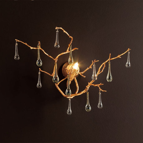 Бра из коллекции Bijout на арматуре золотого цвета. Дизайн выполнен в виде ветвей дерева. Прозрачные подвески-капли из муранского стекла на ветвях. Возможны другие варианты по цвету стекла и покрытию металла. Идеальные пропорции и изящные линии сочетают в себе классические традиции и новаторство нашего времени. Все изделия Serip изготавливаются вручную, имеют органичные формы и цвета, вливаются в интерьер, делая его утонченнее и ярче.