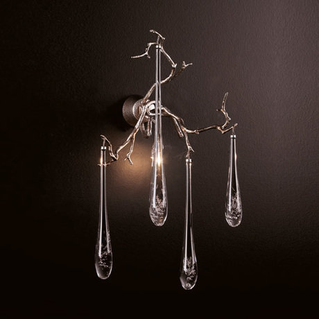 Бра из коллекции Aqua на арматуре серебряного цвета. Дизайн выполнен в виде дерева со сплетением ветвей. На ветвях прозрачные подвески-капли из муранского стекла. Возможны другие варианты по цвету стекла и покрытию металла. Идеальные пропорции и изящные линии сочетают в себе классические традиции и новаторство нашего времени. Все изделия Serip изготавливаются вручную, имеют органичные формы и цвета, вливаются в интерьер, делая его утонченнее и ярче.
