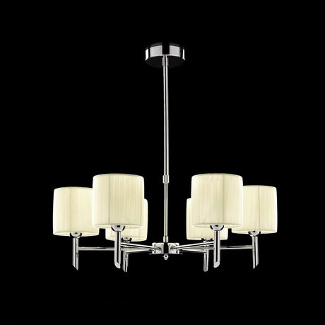 Люстра 6-ти рожковая из коллекции AMETHYST на хромированной арматуре. Текстильные плиссированные абажуры цвета слоновая кость скрывают лампы.