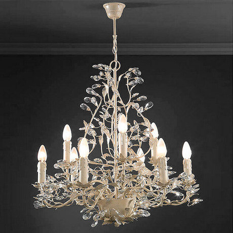 Световые элементы флорентийского подвесного светильника серии VERDI выполнены в виде свечей, размещённых на металлических вензелях с покрытием из серебряной фольги с белой патиной. Люстра украшена декоративными элементами в виде стеблей и листьев. Элементы дополнены подвесками из граненого стекла.