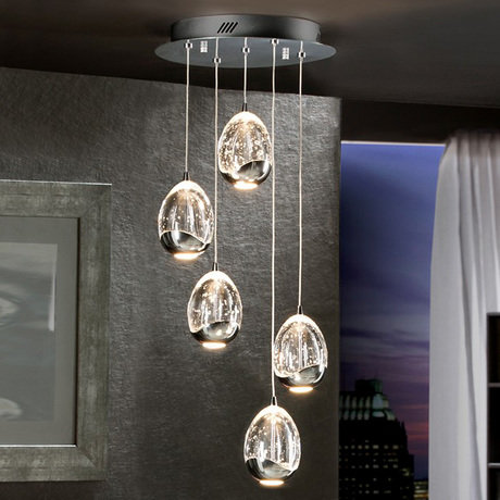 Подвесной светодиодный светильник из коллекции Rocio на арматуре из хромированного металла. Плафоны в форме капли из массивного стекла с декоративными пузырьками внутри. Высота светильника регулируется до 150 см.