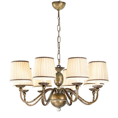 Подвесной светильник серии NIK выполнен в классическом стиле. Под элегантными плиссированными абажурами цвета слоновой кости размещены восемь световых элементов. Основа люстры металлическая с покрытием "золото с бежевой патиной". Данная модель превосходно создаст теплую и уютную атмосферу в помещении. По индивидуальному заказу возможны различные модификации и варианты отделки.