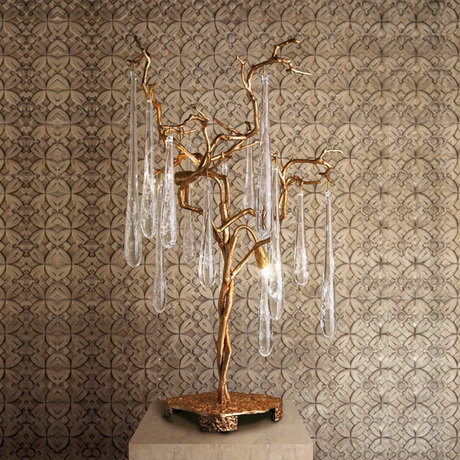Настольная лампа из коллекции Aqua на арматуре золотого цвета. Дизайн выполнен в виде дерева со сплетением ветвей. Сверкающие подвески-капли из муранского стекла на ветвях. Возможны другие варианты по цвету стекла и покрытию металла. Идеальные пропорции и изящные линии сочетают в себе классические традиции и новаторство нашего времени. Все изделия Serip изготавливаются вручную, имеют органичные формы и цвета, вливаются в интерьер, делая его утонченнее и ярче.