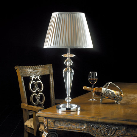 Настольная лампа из коллекции Weki с хромированной арматурой и элементами из прозрачного хрусталя. Светлый текстильный абажур мягко рассеивает свет ламп, а классический дизайн станет украшением любой гостиной.