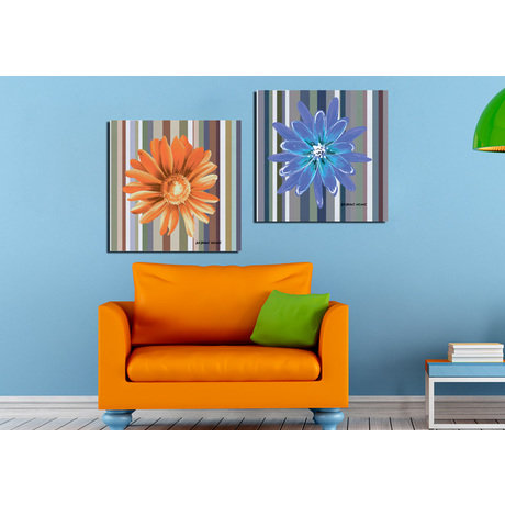 Цветочный диптих "Цветные полоски" станет необычным украшением гостиной, спальни или любой другой комнаты. Яркие пятна цветов на ритмичном цветном фоне смотрятся контрастно и сочно. Колорит картины отлично впишется в светлый интерьер.