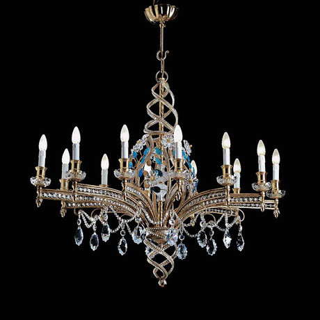 Люстра из коллекции LA TRADIZIONE выполнена из полированной латуни. Цвет арматуры: золотой и серебряный. Дизайн ламп выполнен в виде свечей в подсвечниках. Люстра декорирована прозрачными бусинами и подвесками, а так же бирюзовыми хрусталиками. Высота светильника регулируется до 100 см. Дизайн: STUDIO BANCI. Количество лампочек: 12. Мощность: 12 x 60 Вт. Тип лампы: Накаливания, E14.