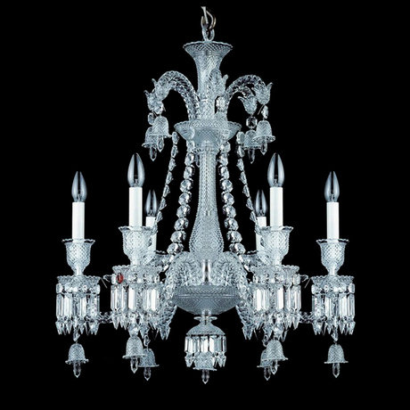 Люстра 6-ти рожковая из коллекции Baccarat выполнена в классическом стиле. Дизайн ламп выполнен в виде свечей в подсвечниках. Ваза, чашечки, кулоны и подвески из хрусталя и стекла прозрачного цвета. Арматура выполнена из металла цвета хром. Высота светильника регулируется за счет звеньев цепи. Количество лампочек: 6. Мощность: 6 x 40 Вт. Тип лампы: Накаливания, E14.