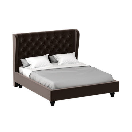 Двуспальная кровать с высокой спинкой и декоративными элементами . Спинка декорирована пуговицами. Кровать установлена на фигурные деревянные ножки. Выполняется в трёх вариантах размеров спального места: 2000х2000 мм, 1800х2000 мм и 1600х2000 мм. Высота спального места:425 мм. Основание: металлическое с эластичными латами из фанеры. Ножки: декоративные деревянные элементы на металлической опоре.