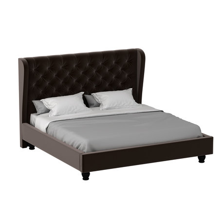 Двуспальная кровать с высокой спинкой и декоративными элементами . Спинка декорирована пуговицами. Кровать установлена на фигурные деревянные ножки. Выполняется в трёх вариантах размеров спального места: 200х200 см, 180х200 см и 160х200 см. Основание: металлическое с эластичными латами из фанеры. Ножки: декоративные деревянные элементы на металлической опоре. Высота спального места: 42,5 см.