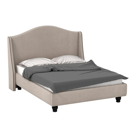 Двуспальная кровать с высокой спинкой и декоративными элементами. Спинка декорирована молдингом. Кровать установлена на фигурные деревянные ножки. Выполняется в трёх вариантах размеров спального места: 200х200 см, 180х200 см и 160х200 см. Основание: металлическое с эластичными латами из фанеры. Ножки: декоративные деревянные элементы на металлической опоре. Высота спального места: 42 см