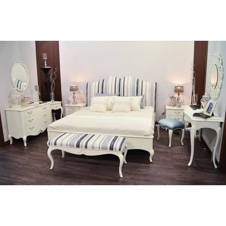 Кровать с фигурным изголовьем выполнена в классическом стиле. Отделка молочно-белый матовый лак. Изголовье обито тканью в полоску из ассортимента фабрики. Оригинальность модели обусловлена гнутыми ножками и фигурным основанием впереди. Сделана из высококачественного МДФ высокой плотности и массива дерева. Поставляется с решеткой, без матраса. Размер спального места 180*200см. Комплектуется решеткой производства России.